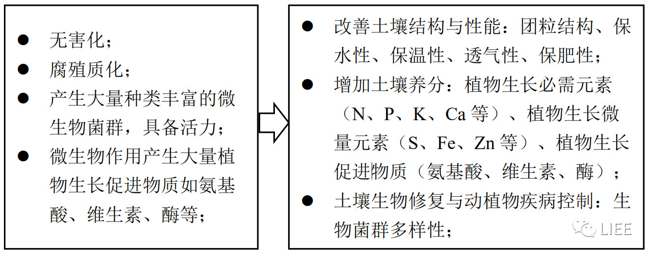 自然堆肥过程持续产生腐殖质,从而帮助微生物生长,微生物再分解有机物释放出能够被植物吸收的营养物质,而植物吸收会释放出更多的有机物,由此形成一个良性的动态有机循环。此外,有机废弃物自然堆肥过程中,木质素会被降解,导致EC值(电导率值)降低,同时寄主微生物会产生腐殖质,最终成为供植物吸收的二氧化碳。