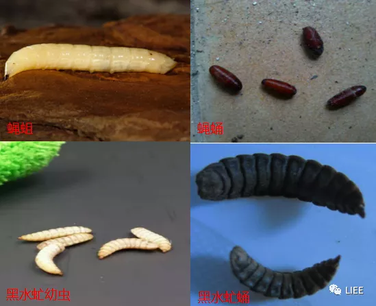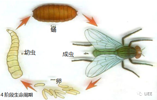 果蝇、家蝇、黑水虻均是4阶段生命周期:卵-幼虫-蛹-成虫,生命周期在20-50天不等,一般黑水虻要50天,苍蝇只有20天。